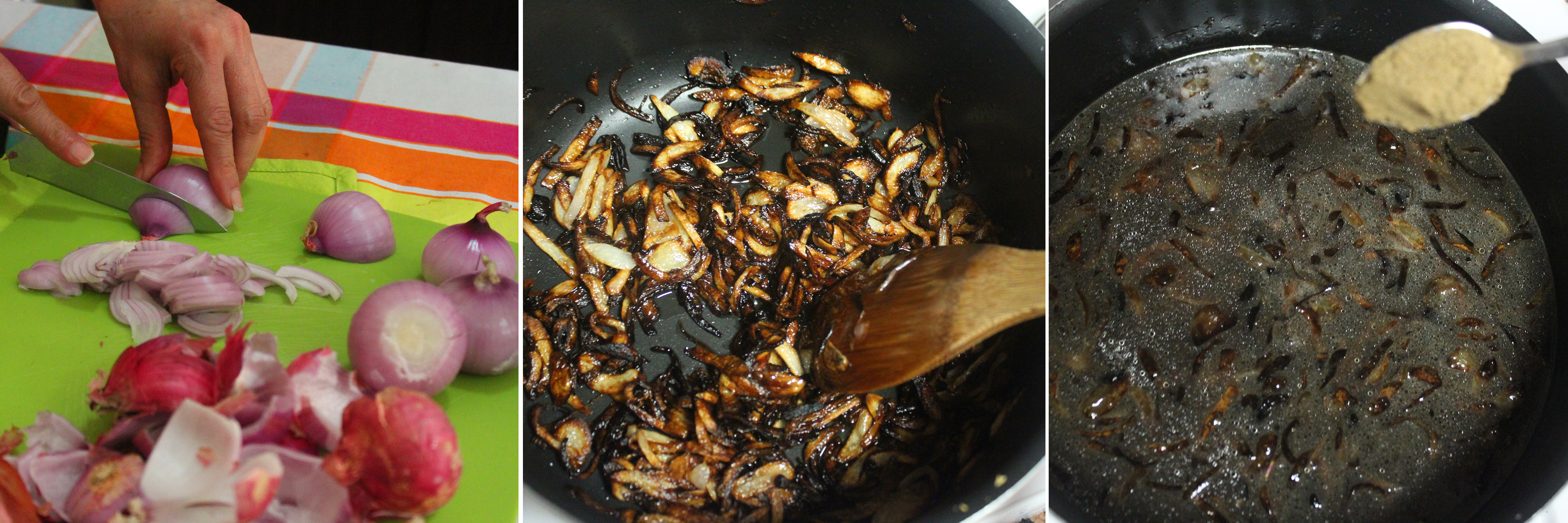 Cut 5 medium onions a la julienne and fry until dark gold brown. Add 8 cups of water, 1 tsp salt, 1 tsp caraway and 1/2 tsp cumin and bring to boil and simmer for 10 mns then take out the onions aside.