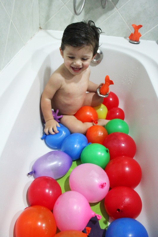 Published May 6, 2014 at 866 × 1299 in Water balloons sensory play – bath time fun!