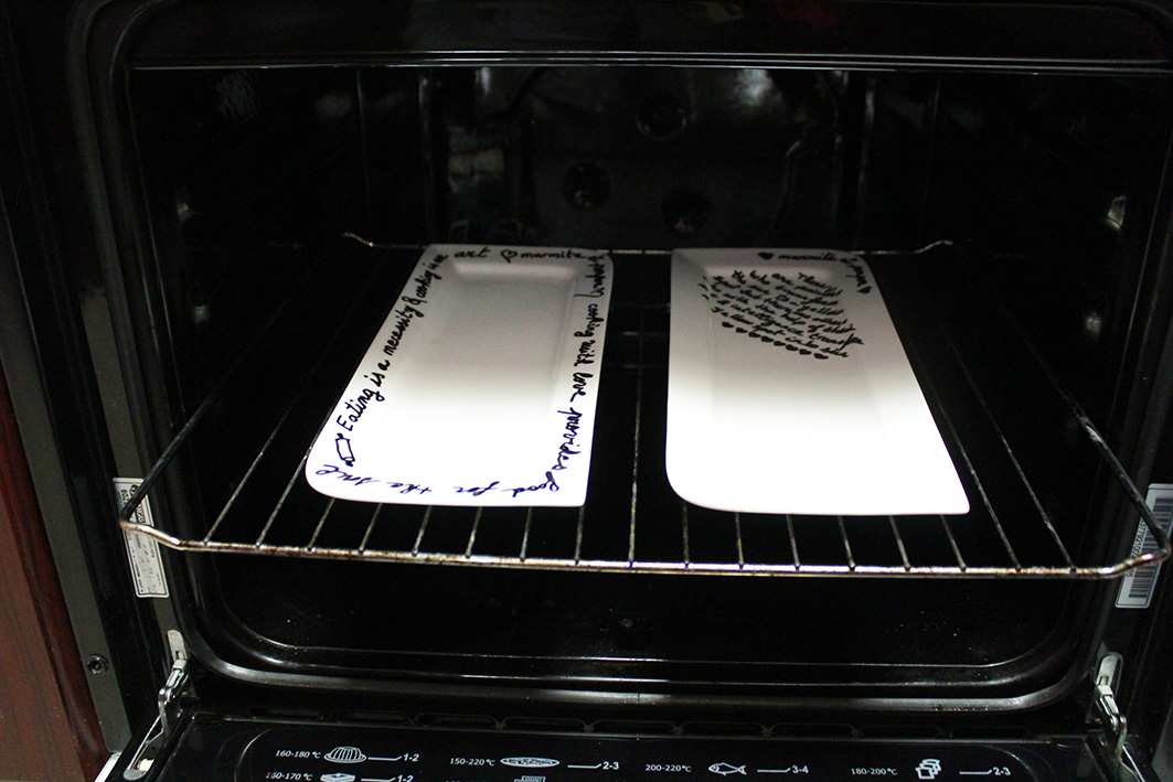 Write with a sharpie (permanent marker) on a plate that’s oven safe, bake for 30 mns (180°C) and that’s it! Your design is permanent and safe!