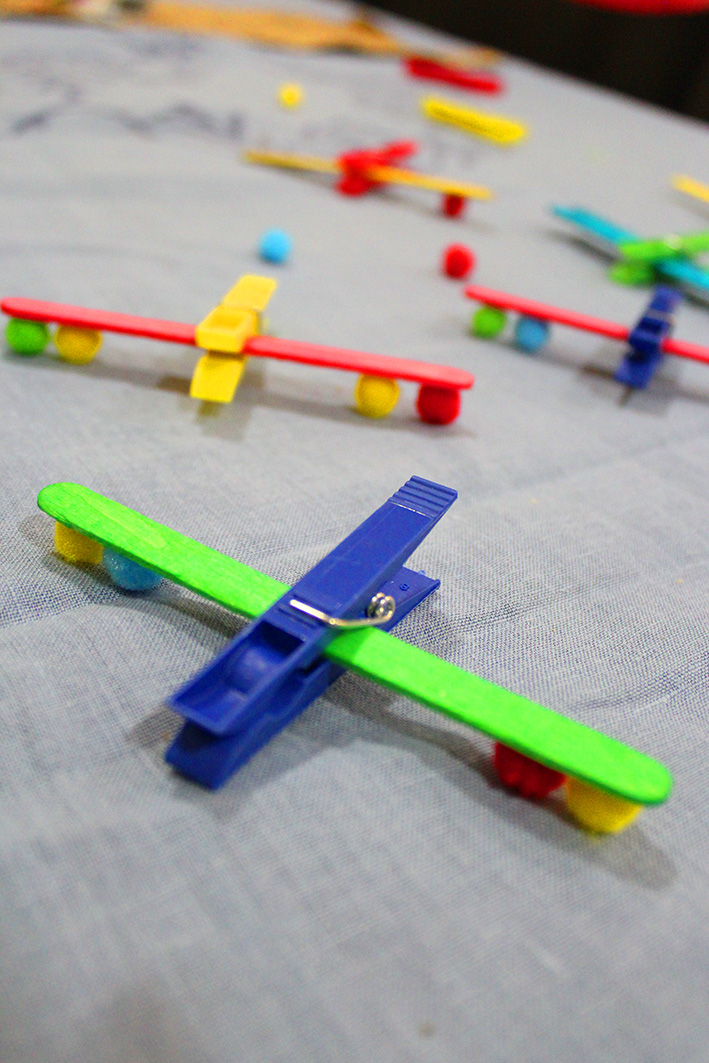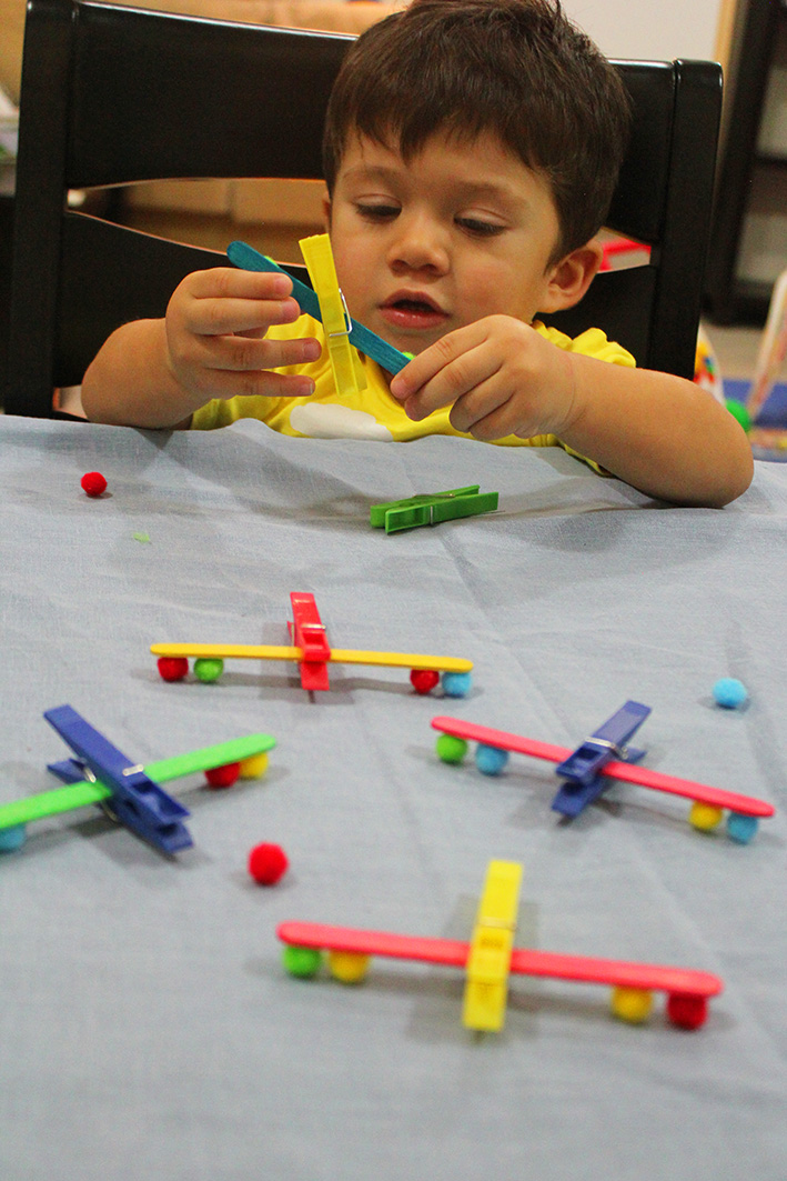 We travel a lot, therefor airplanes became familiar to my son who is very enthusiastic for. Today we decided to travel somewhere in our imagination using clothespin, popsicles sticks and pompoms.