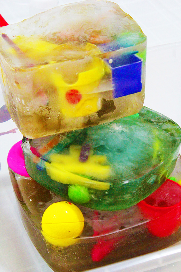 How to do this beautiful sculpture? I put Nady’s favorite small toys in 3 different shape containers, added few drops of food coloring and froze them for over night. To remove the ice, I ran water over the outside of each container and held it upside down. I placed the three parts on top of each other to make the sculpture like form.