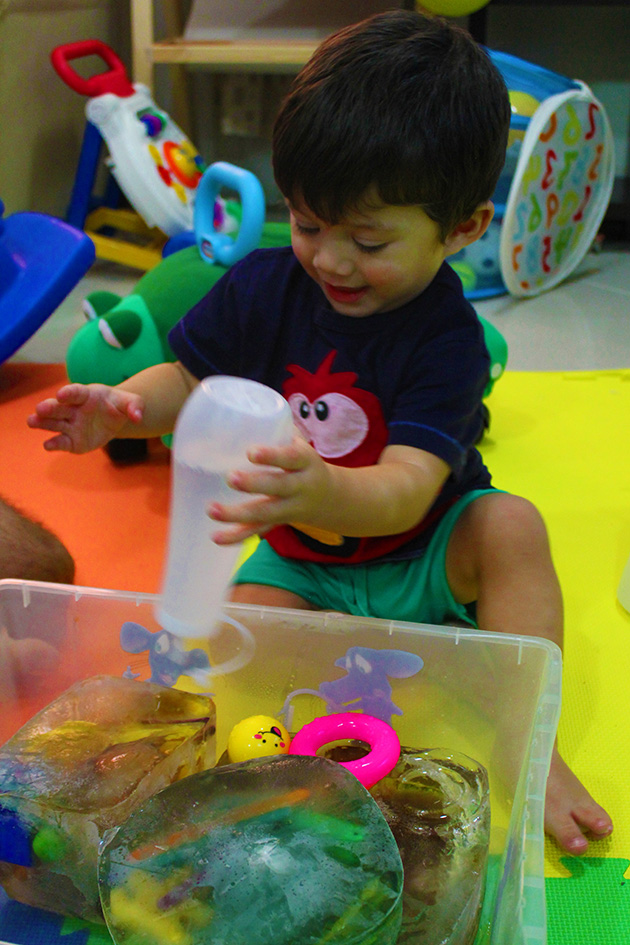 Nady was so enthusiastic, he was eating raisins when we started the play, he grabbed the bowl to fill it with water to throw it on ice, experiencing different ways maybe the gush of water can melt the ice faster!