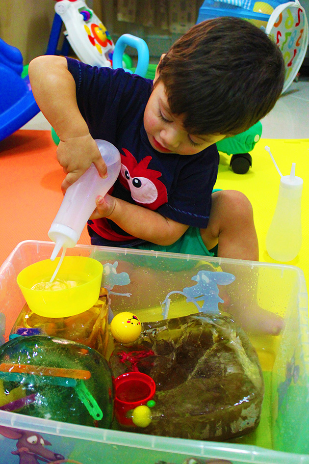 It’s a fun activity for all the family actually, we were all playing with Nady! We must admit it’s a senses stimulating play, (experiencing hot – warm – cold and of course solid – liquid or frozen – melted) it fosters learning in all developmental areas and engages extra words to your kid’s lexicon.