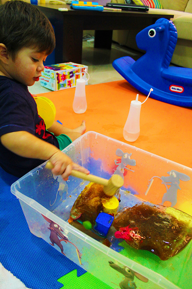 An enthralling sensory play to experience melting ice. Very simple activity but has a lot to discover and learn. You will hear lots of ahhhhhs once your kid touches the ice. Nady was so fascinated by his frozen toys and got so excited to melt the ice and take them out, he got so driven, he forgot how cold the ice was.