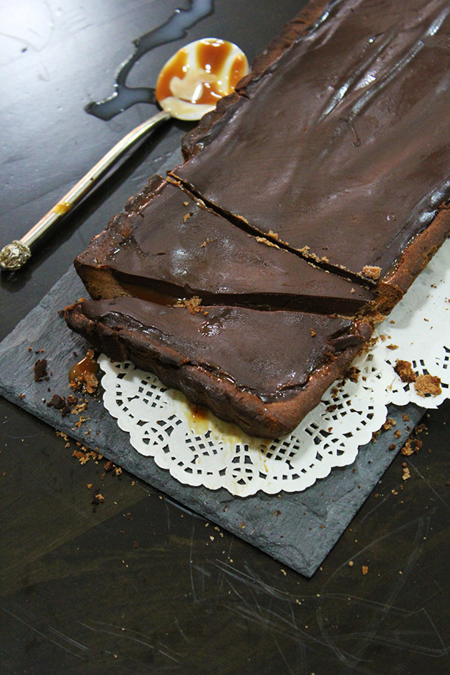 A decadent chocolate and caramel tart, cures the cravings of all chocolate lovers. Fleur de sel chocolate and caramel are a winning combo, anyone who is into dessert will be totally thrilled with this indulgent tart!
