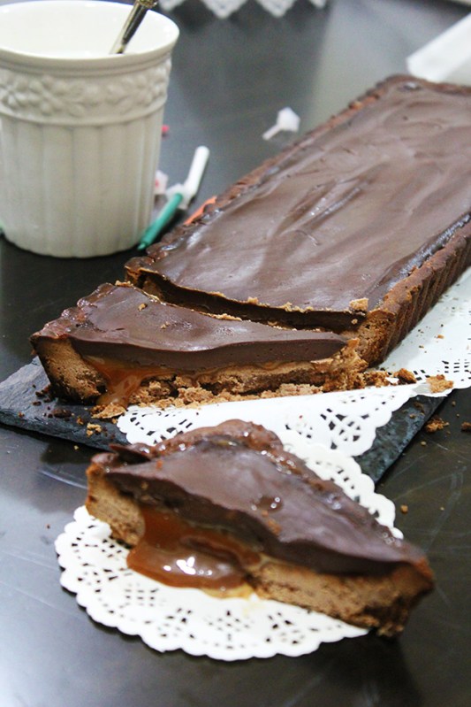 Published October 7, 2014 at 630 × 945 in Decadent dark chocolate “fleur de sel” and caramel tart