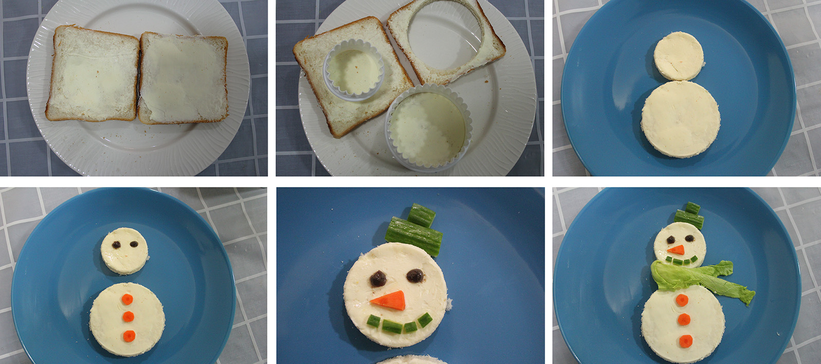 You will need: 2 slices of bread, spreading cheese, carrots for the buttons and nose, cucumber for the hat and mouth, olive for the eyes, and lettuce for the scarf.