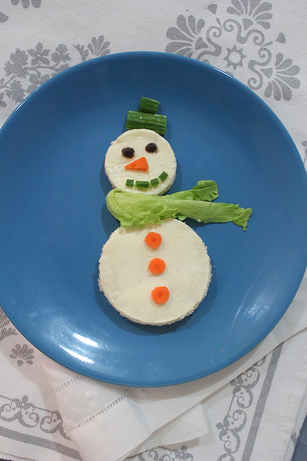 Christmas fever is spreading throughout our house all times! No doubt, we wake up so excited thinking of Christmas; Nady starts by a “bonjour sapin”(good morning to the Christmas tree), he checks all the decorations especially the ones he participated in doing, then he goes to the advent calendar to check his daily treat. Today i wanted to surprise him with a christmassy breakfast: Snowman on a plate!
