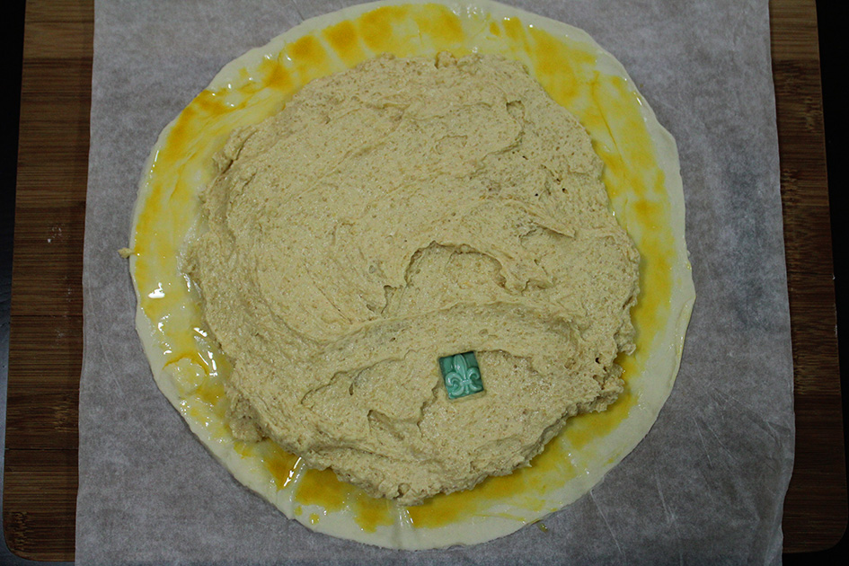Place the smaller of the two circles on a piece of parchment paper. In a small bowl, combine the egg yolk with a tablespoon water until smooth. Using a pastry brush, brush the outer rim of the dough with it by a width of about 2.5 cm (1 inch). Make sure not to wet the actual edge of the dough, or it will impede its rise. Pour the crème d’amande in the center and spread it inside the eggwash ring.