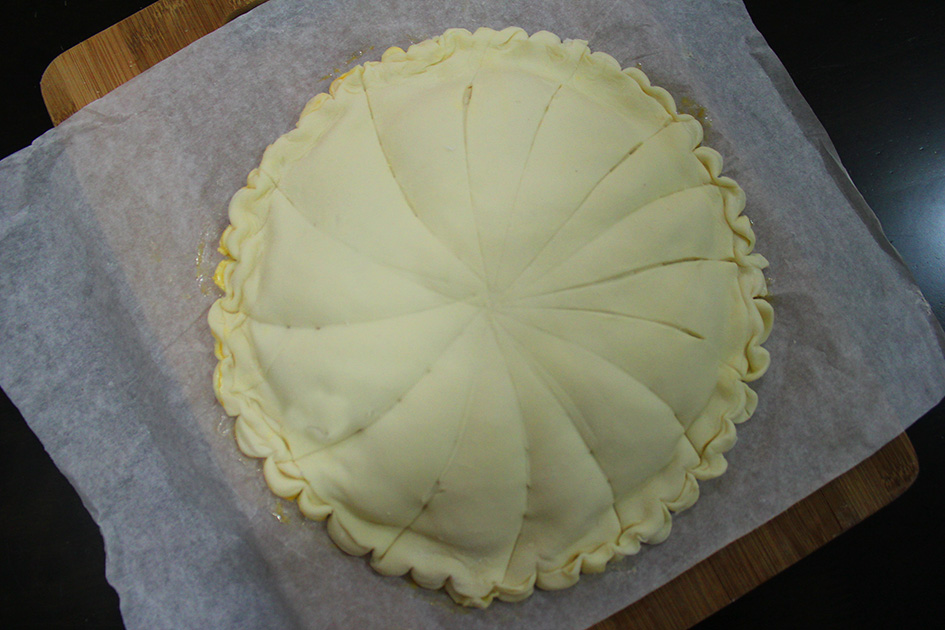 Using the back of the tip of your knife, draw a decorative pattern on top of the galette. I did a sun shaped pattern. Holding your knife upright, blade down, and using the dull side of the blade, push the dough inward where each sun ray ends, to create a festooned pattern.