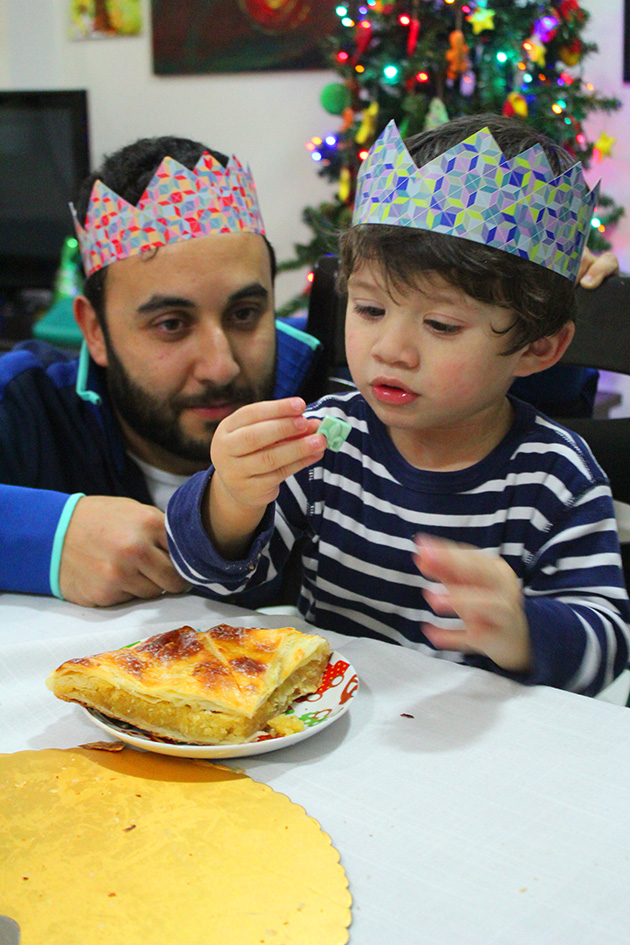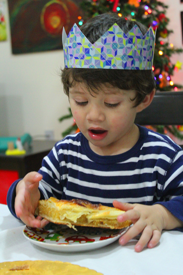 The ritual says; the youngest child of the family hides under the table, an adult divides the galette in even slices, and the child decides which slice goes to whom. Whoever gets the fève in his serving is named King (or Queen) for the day, gets to wear the paper crown and picks who the Queen (or King) will be.