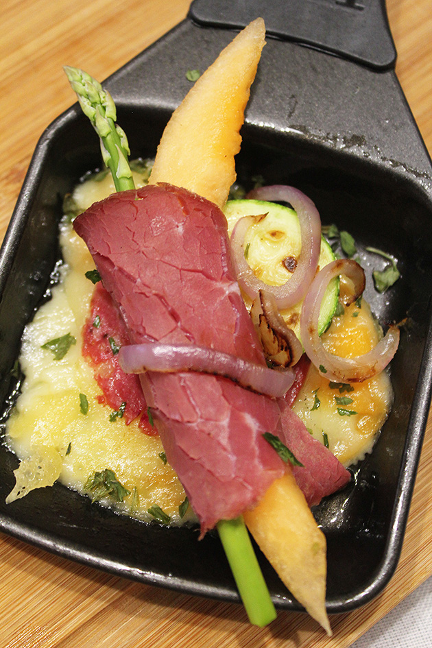 Raclette is a type of cow milk cheese, consumed in Switzerland and France. It’s commonly used for melting in small pans known as coupelles that are placed under a specialized grill looking like an electric table-top grill. Then the slices of melted raclette are poured over veggies, pickles, charcuterie and meat. Served with wine to seal the deal!