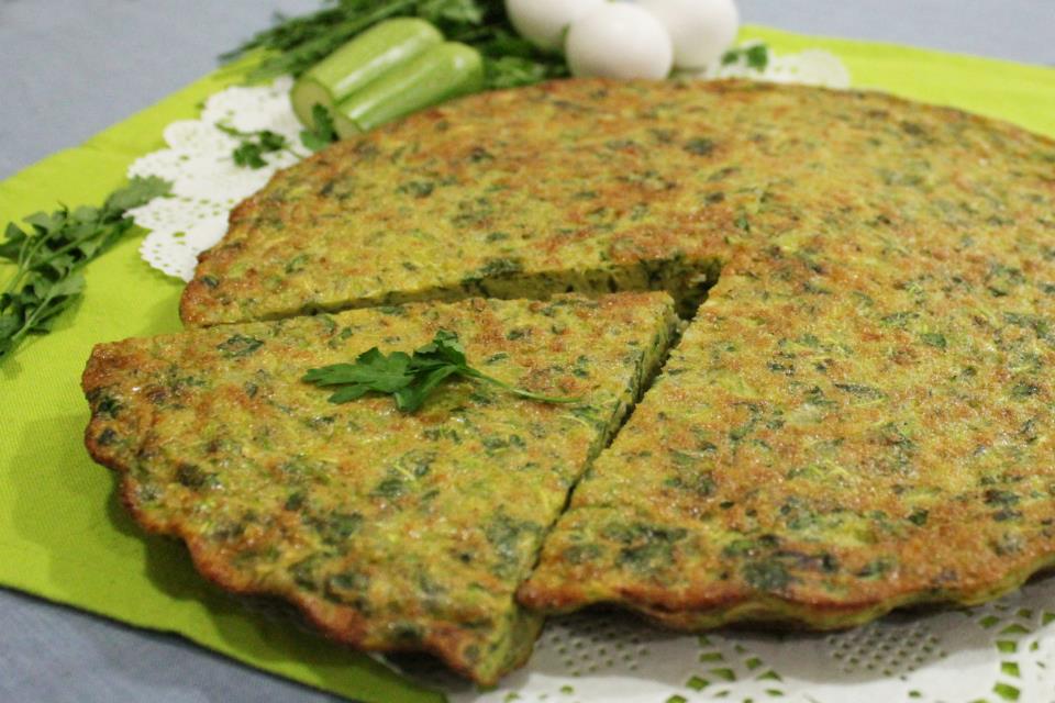 Chop one large onion, fresh mint and a bunch of parsley, then grate 4 large zucchini and add to the eggs.