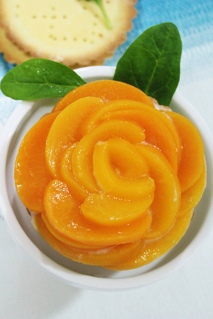 Remove form oven and let it cool. Take out the pastry cream already prepared and stored in the fridge, spread a rich layer of the cream before adding the peach slices.
