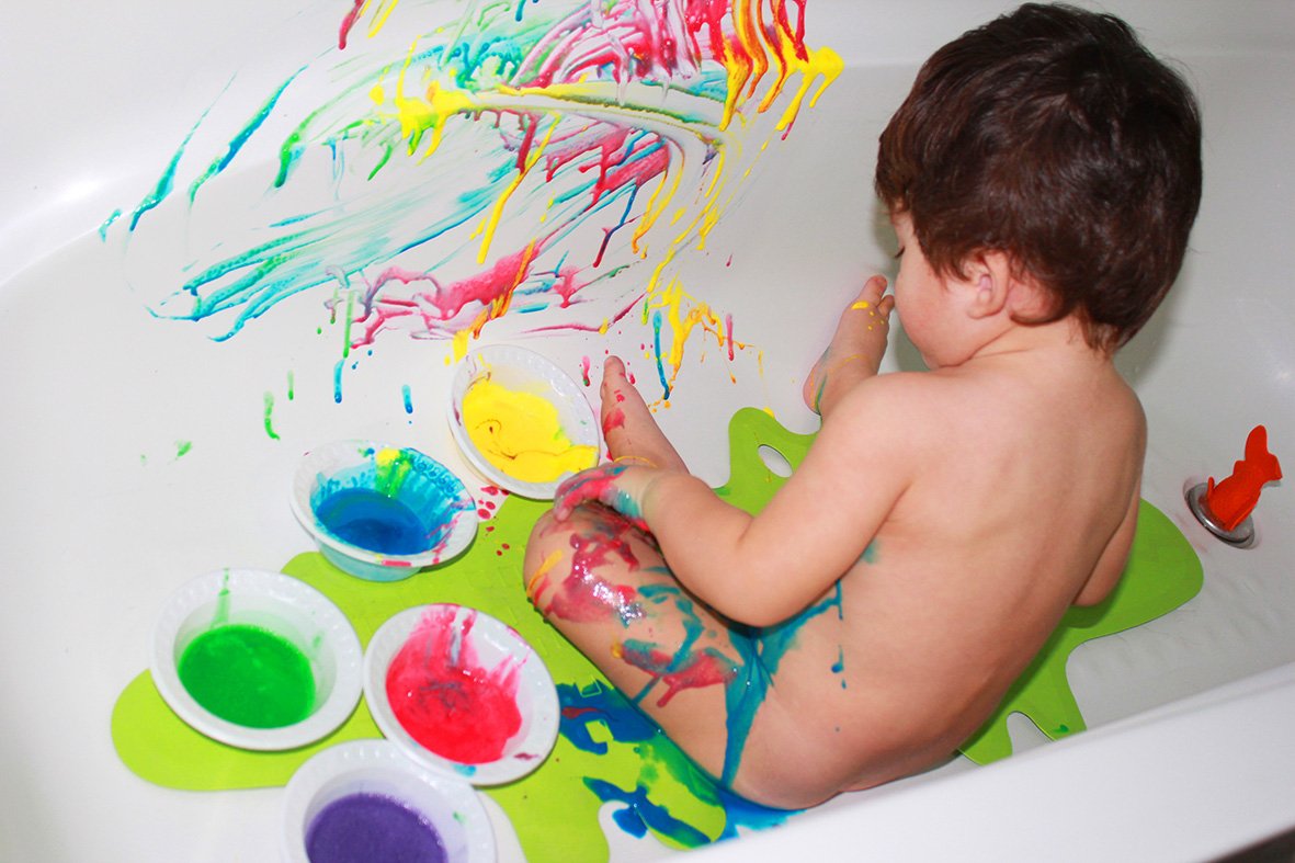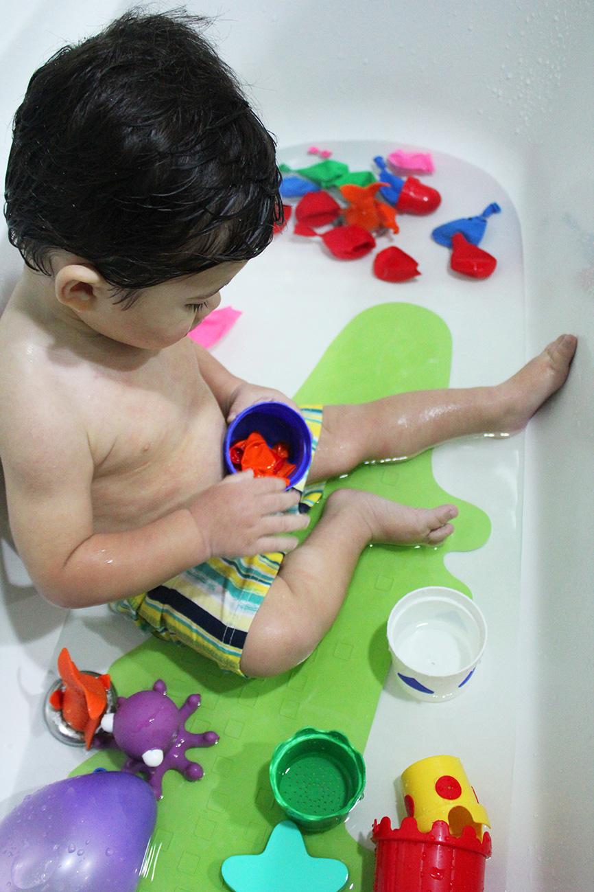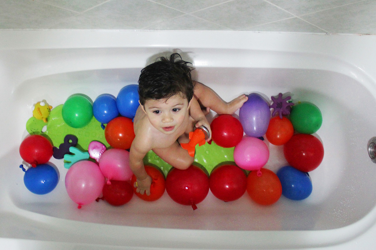 Who doesn’t remember water balloons from childhood? I filled about 20 balloons with water and placed them in the tub to extend the bath time fun.